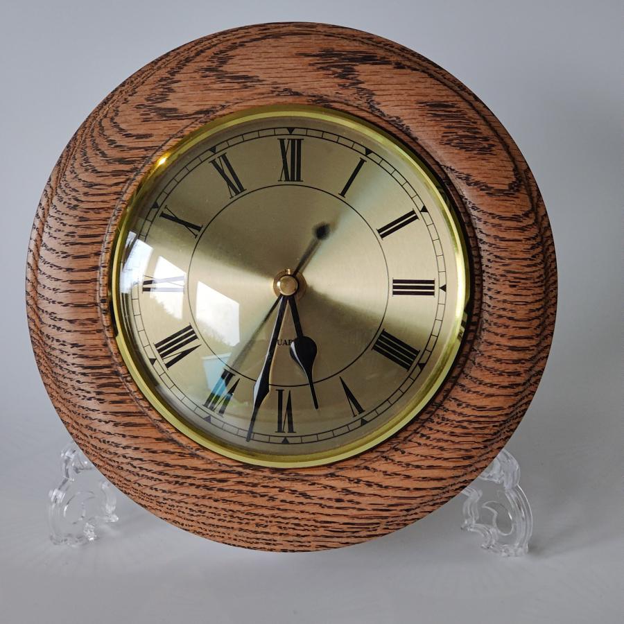 13cm gold coloured clock with gold face and Roman numerals. Set in an oak surround which has been treated with black wax to enhance the grain. Quartz movement.