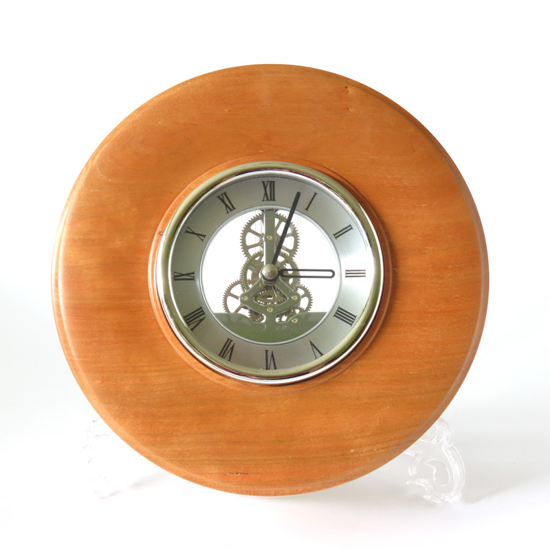 A cherry wood wall clock with silver 1ocm skeleton clock movement showing exposed workings. Overall diameter approx 20cm. Quartz movement.