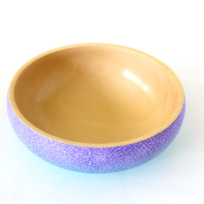 A textured and coloured sycamore bowl, with purple and green colours on the outside. 19cm diameter.