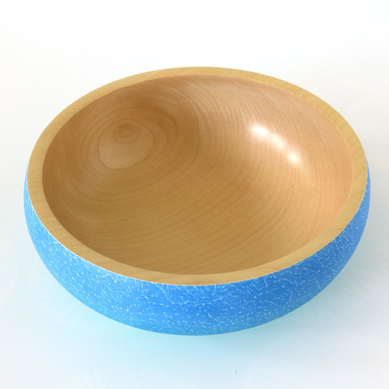 A textured and coloured sycamore bowl, with blue and green colours on the outside. 18cm diameter.