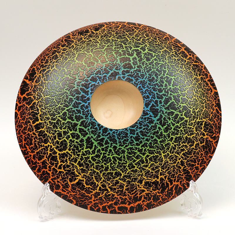 A coloured sycamore platter with colours emulating a volcanic pool and a crackle glaze for added drama! The platter is intended to be decorative and could be displayed on a stand or mounted on a wall. Diameter 31cm.