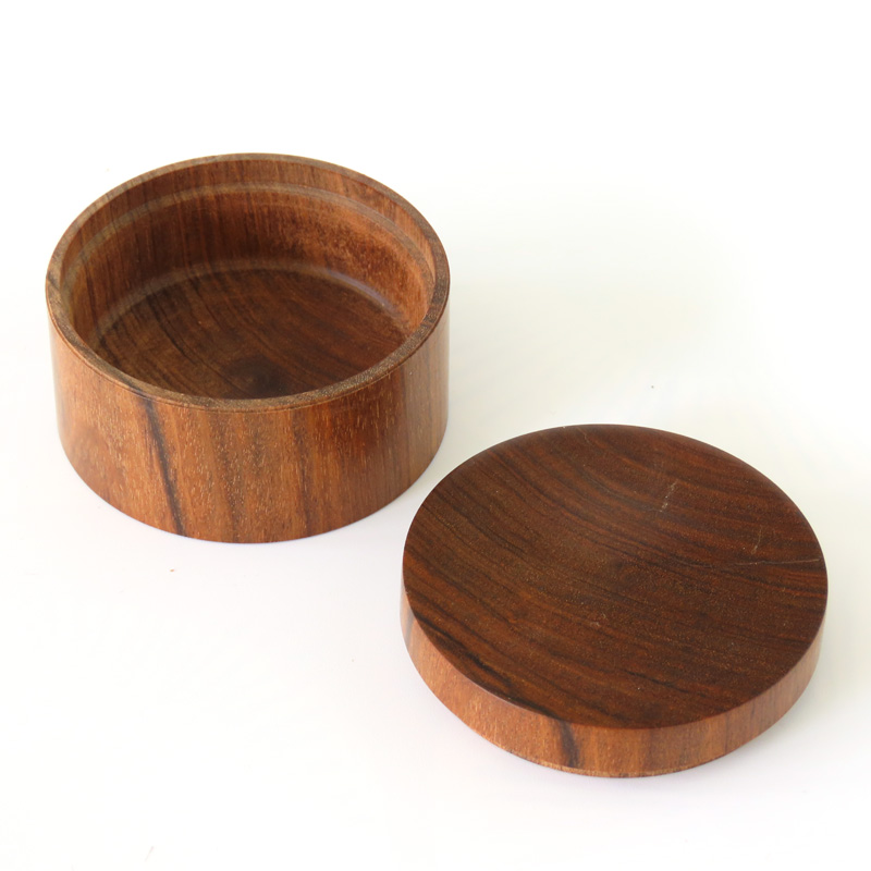 A small teak box with push on lid. The teak was “recycled” from old stock. Diameter approx 5cm.