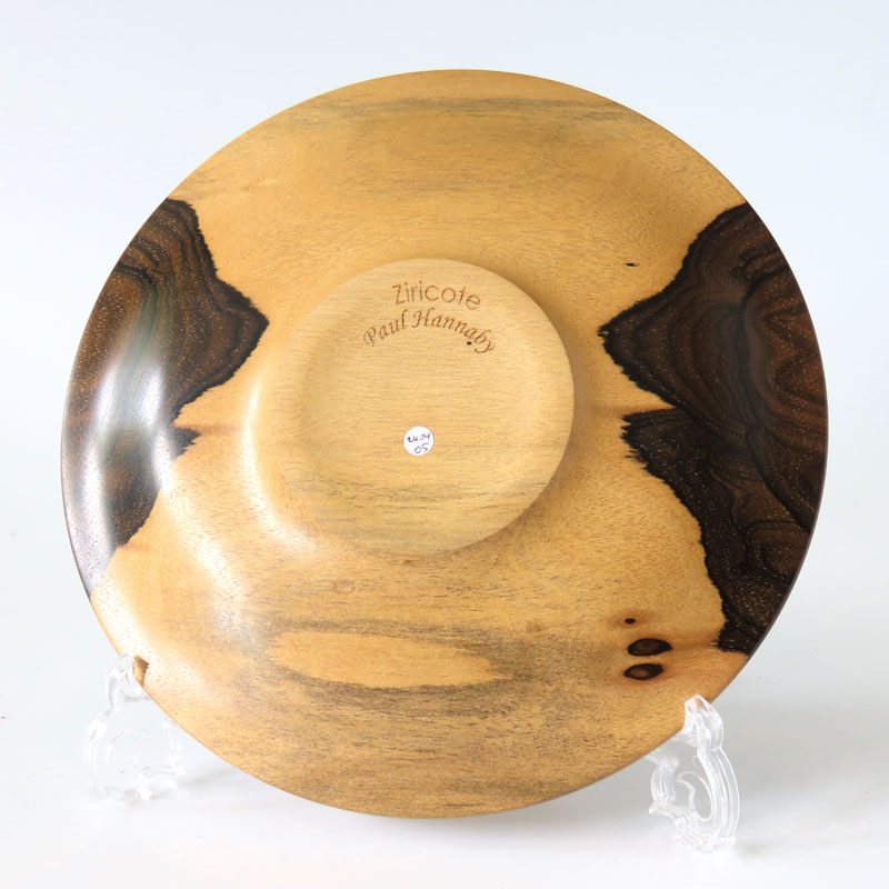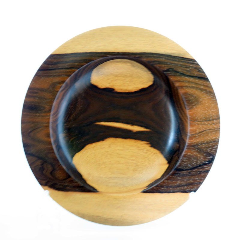 A ziricote bowl with contrasting heart and sapwood. A shallow bowl with a wide rim to show off the grain to its best. Diameter 22cm